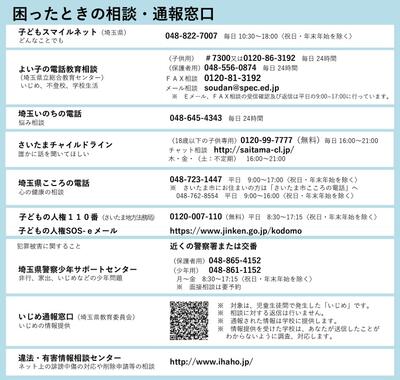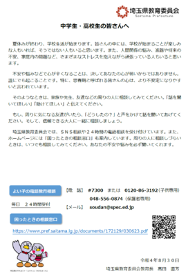 かけがえのない子供たちを守るために、埼玉県教育委員会教育長からメッセージが届きましたので、掲載します。詳細は、本日学校から配布された通知文をご覧ください。