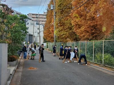 落ち葉清掃の第1日目は、生徒会役員と整美委員会(生徒33名)、そしてPTA(24名)のボランティアの方々が参加し、学校周辺の道路や近隣の敷地に入り込んだ落ち葉を、みんなで協力して清掃しました。