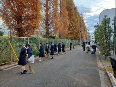 今年も、生徒会とPTAが協働してボランティアを募り、学校周辺の落ち葉清掃を開始しました。
