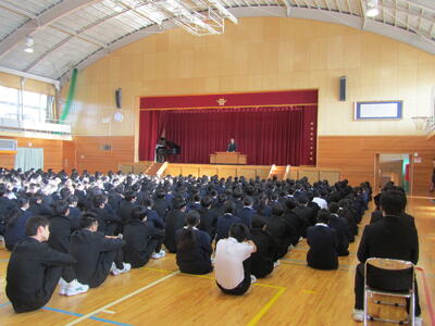 3学期 始業式 ~1月の行事から~ 投稿: 一中 (15:58) 8日(木)、14日間の冬休みが終了し、3学期がスタートしました。日数こそ多くはありませんが、中身の濃い学期、まとめの3学期の始まりです。1年生はスキー教室、2年生は校外学習、3年生はいよいよ進路実現の時期を迎えます。